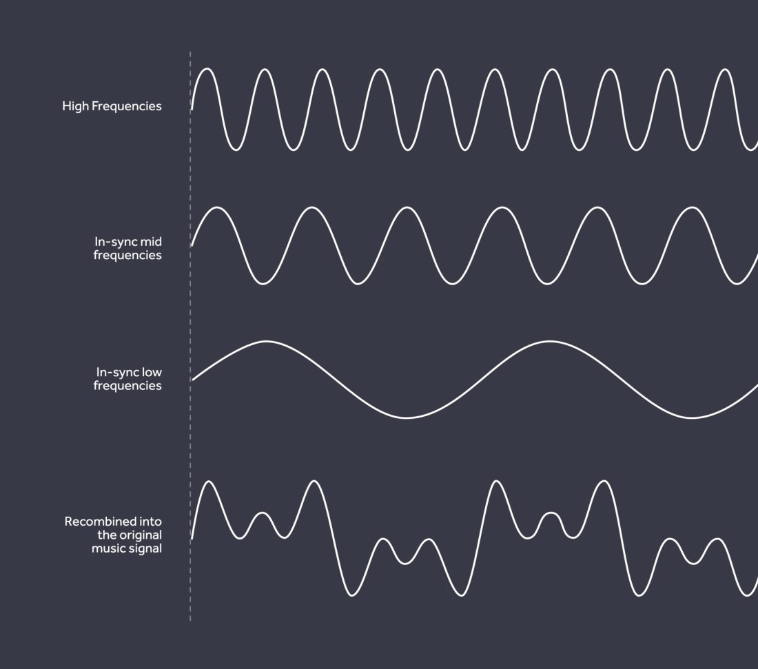 Exakt delays the higher frequencies so they line up with the lower frequencies. When the music is recombined at your ear, the fundamental of each note and all the harmonics arrive perfectly in time, preserving the true character of each instrument.