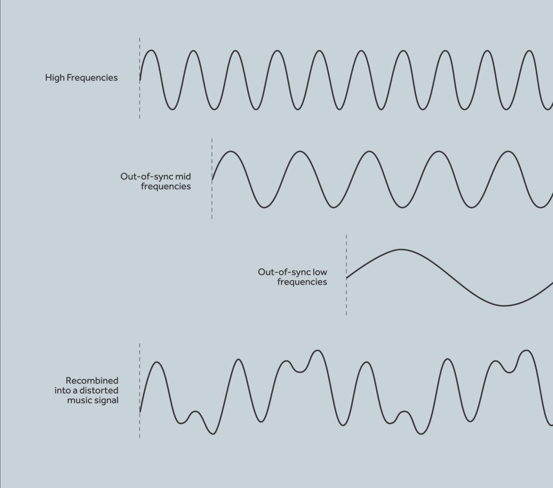 The lower the frequency, the more it’s delayed as it passes through the crossover. This means the different frequencies that make up each note are no longer synchronised. When the music is recombined, it’s a flawed version of the original and the instruments are distorted.